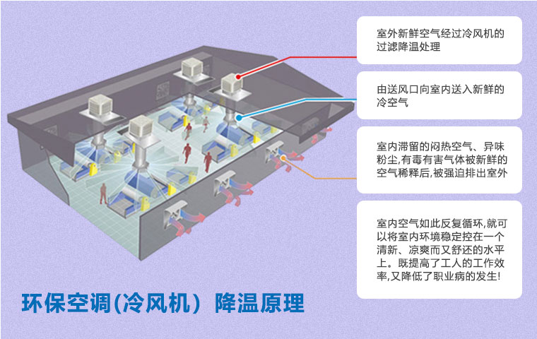 在空氣不流通的環(huán)境中,尤其是化工車間,容易產(chǎn)生建筑綜合癥,如悶熱、頭疼、眩暈、過(guò)敏、咳嗽等不適癥狀。使用環(huán)??照{(diào)(冷風(fēng)機(jī))通風(fēng)降溫方案即可以有效降溫,又能保證空氣流通